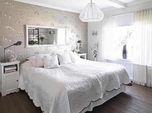 田园的自然怡人对身处喧嚣繁华又追求安静的人来说有着致命的杀伤力,因为我们可以屏蔽外界的喧嚣独享时光的宁静。白色主调的空间营造出富有现代感气息的空间,简洁、明快的生活格调也穿插其中,简单勾勒的吊顶之上垂下的白色似南瓜灯罩的灯是田园中最常见的元素,白色帷幔的窗帘遮挡住刺眼的阳光而室内的光线更加充足,床头的浅色系碎花壁纸将空间装饰的格外好看,同样碎花也是田园风格最经典的元素。屋内精致的插画与镜子折射出来的插花吐露着芬芳的气息,将大自然的味道带入屋内,弥漫着清新的风格。