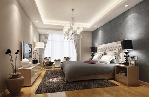 简约遵循着简约不简单的格调,走的是有内涵的风格。简单硬朗线条勾勒而成的吊顶之上除了精致的水晶灯还环绕着几盏射灯散发着光芒,在白色的空间内穿插进灰色系搭配,避免了白色带来的单调,白色的落地窗前纱幔随风轻舞,小巧的桌椅供主人闲暇时刻小憩或是聊以看书、喝茶。乳白色不加装饰的电视背景墙灰色的床头背景墙相辅相成,实木质的地板与同材质的床头柜、电视柜为空间带来自然的气息,别致的陶罐插花与黑色的床头灯衍生浓浓的怀旧风。