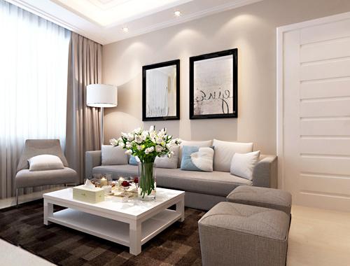 客厅主要以高级灰色搭配白色为主色调,比较凸显时尚气息。稍亮色的木地板上放置一款深色地毯,浅、深色结合更有层次感。纯白色茶几造型简约、线条干净利落,与白色抱枕形成一种对称美。从低处顺势而上的茶几、抱枕、落地灯、天花板以色调将空间恰当的衔接起来。看起来和谐而富有节奏感。白蓝相间的抱枕、黑白色经典画饰、绿意盎然的花束更似居室的点睛之处,使居室更显优雅与大方。