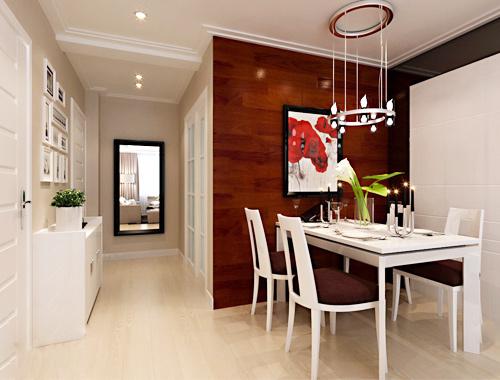 方形白色桌子被深酒红色凳子围绕着,精致的餐具,时尚造型吊灯,整体营造出一种优雅、端庄的时尚范。以接近酒红色的木饰面板为餐厅的背景墙,镶着一幅娇艳的画饰。在百合花束的映衬下,更显魅力与雅致。卧室的过道放置一面镜子,延伸空间的视觉感,更使居室显得通透。w