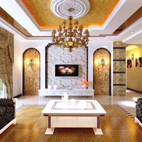 白色与金黄色的交织的环境之中便是欧式风的完整呈现。吊顶出用白色的线条加上金黄色的色彩渲染,中心处的白色圆心刻画出欧式风的图案,流露处处浓浓的欧式气息。造型讲究的金黄色吊灯在空间内显得高贵华丽,使整个空间极富韵律感且大方典雅。对称的拱形图案营造出独特的欧式背景墙,以白色和黄色为基础的花式壁纸流露出华贵的气质,墙上的壁灯散发出暖黄色的光芒照射在同色系的地砖之上,柔美的色彩搭配在空间内散发出柔和气息兼具欧式的高贵典雅,在空间之内显露无遗。