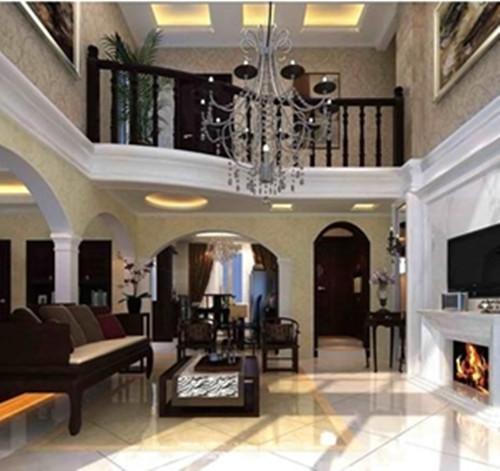 跃层装修跳脱出白色与金黄色的色调空间,以淡黄色和白色为主色调。底层客厅纯白的电视背景墙下带有独特欧式格调的壁炉成为空阔空间内的亮点,与之对应的是暖黄色镂空的拱形门,未加遮挡的拱形门使得空间视野开阔,实木质的家具搭上欧式花纹的软装弥漫着着淡淡的欧式气息。空间里造型独特的吊灯之上燃烧着的蜡烛是欧式文化最典型的代表,在阳光的照射之下营造出华丽、高贵、温馨的氛围。