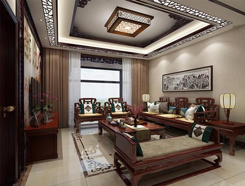 客厅基于中国传统建筑设计,将古典韵味与现代生活相结合。而中式风格的装修,着重点在于天花与门窗部分。设计师以中式精美独特的雕饰元素运用于天花板造型、别致窗边雕刻,流露着几分古香气质。顺势而下,以墨梅的字画为电视背景墙的客厅,可见充分的利用到焦点位置来凸显屋主渊博内涵的高雅格调。与之相映衬的背景墙,以浅色壁纸为基底,镶饰一幅大气不失雅韵的中式山水画,巧妙的渲染出一种端庄、大雅的居室氛围。家具上的选择独具匠心,糅合了中式家具厚重感、浑然天成的轮廓以及现代家具的舒适感,凸显一种人性设计。再辅以红木材质打制室内家具,古香古色的色调与居室的中式文化气息相呼应,分外和谐。设计师以雕花纹理的瓷砖铺装地面,既考虑到实际起居生活的便利,又与天花无形中构成一种对称美。一盆雅致花束、一瓶素雅花艺、几个复古绿的抱枕成为居室浓墨重彩的笔触,为居室增色不少。再摆置两盏中式韵味浓厚的复古灯具,有种梦回大唐的时光错觉感。