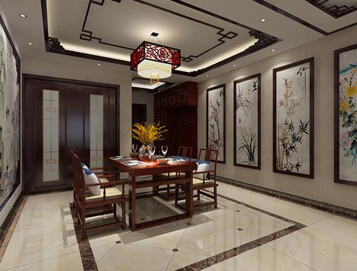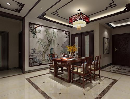 尊重传统又不固守传统,传承传统又施以创新。与客厅相一致的天花设计,是中式韵味的独特展现。以雕花镂空灯罩搭配现代灯具,在暖色灯光的烘托下散发着优雅的馨香气息。红木家具迎着光色,分外柔美清雅。设计师对空间布局十分考究,餐厅空间相对来说比较空阔,以大幅画饰来填充空间的空阔感,既与空间的大气感相映衬又与居室风格的文化氛围相融合,可谓是走心之笔。