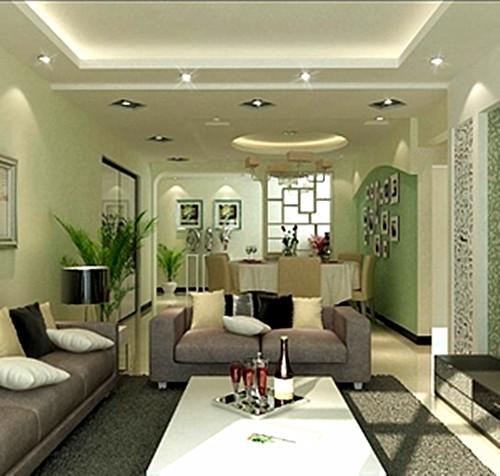 设计师采用纯净的白色与清新的绿色作为空间主色调,稍带温暖的淡黄色渲染空间,营造出安静自然不失温馨的氛围。白色作为的基调,便于空间内多颜色的使用,地面空间的灰色调着重突出了客厅的空间,灰色的布艺沙发与深灰的地毯搭配白色和黑色的软装成为浅色空间内亮眼一点。白色的茶几在灰色布局的空间之内与吊顶遥相呼应,符合设计的色彩布局。