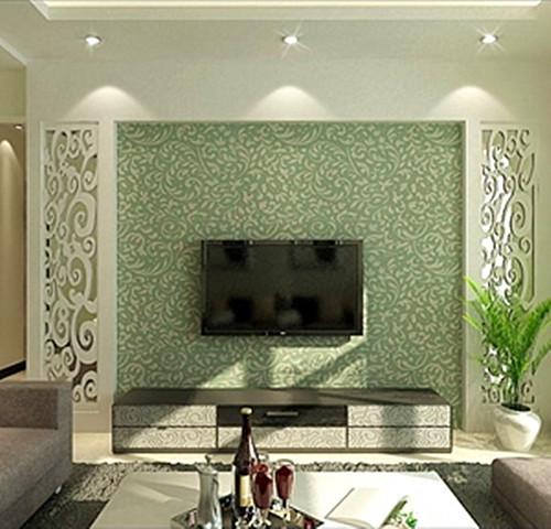 电视背景墙作为客厅的中心视点,用空间主色调绿色和白色作为铺垫。以清新自然色的绿色作为电视背景墙的中心与空间主体相互呼应,辅以镂空花纹对称的隔断凸显了田园风情,上方空间用射灯辅助光线,整面空间显得简单通透,灰色的电视柜与绿色的盆栽形成鲜明对比,流露出的自然气息弥漫整个空间。