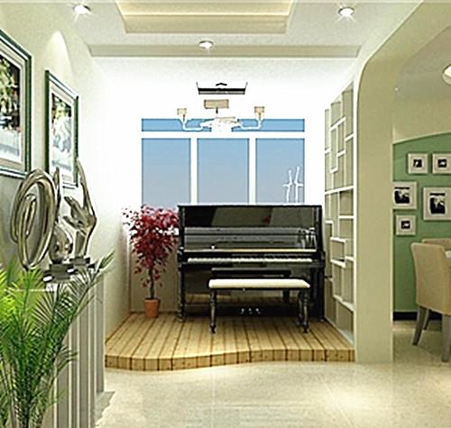 依窗而搭的小平台充分利用了狭窄的空间,木质地板的平台上放置的黑色钢琴成为主人学习或是陶冶身心的小天地,精致的吊灯装饰单调的空间,一旁的书架隔断显示出设计师的用心,将餐厅与此间分隔开,可以在置物架上摆放书籍或是摆件,而空间也得到的充分利用。