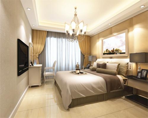 白色的色调凸显空间的安静也使得光线更加明亮,而暖黄的色调将安静单调的空间变得温馨,灰色轻盈的帷幔清新灵动,阻挡了炙热的阳光与外界视线的窥探,保护了主人的隐私,暖黄色的窗帘与周围的空间色调完美契合,白色带黄色纹理的地板符合空间主色调,白色与灰色的相间的家纺与空间色彩布局遥相呼应,精致的吊灯洒发出暖黄色的光芒,使得空间光线更加柔和,营造出温馨宁静的睡眠空间。