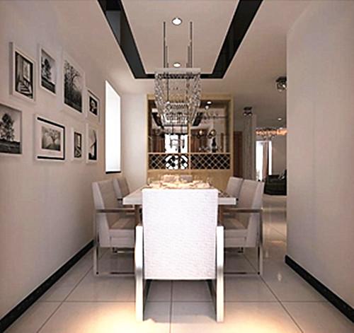 餐厅遵循白色的主色调。辅以少许的黑色元素装饰。简单的平面吊顶黑色的框架圈出灯具空间也突出了空间的色调。垂直的水晶吊灯延伸到餐桌上方空间,拉伸了视觉感官。纯白的墙壁之上错落有致的灰色壁画与黑色线条遥相呼应。白色的桌椅显得整洁而干净,金属质感的餐椅扶手在空间之中显得更加独特。