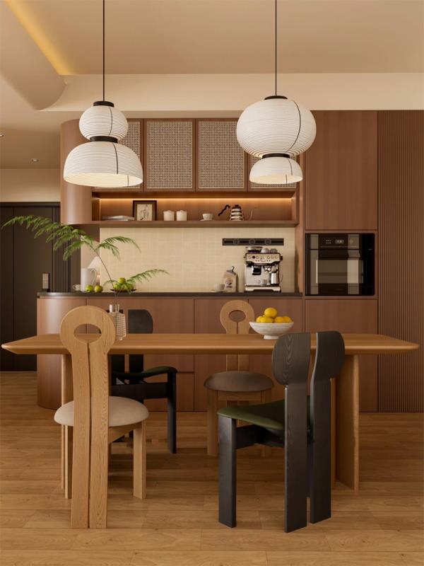 餐厅区域:木质餐桌搭配造型独特的椅子,复古又时尚。个性吊灯洒下暖光,藤编元素的餐边柜增添了自然气息,在这里用餐,每一口都充满仪式感。