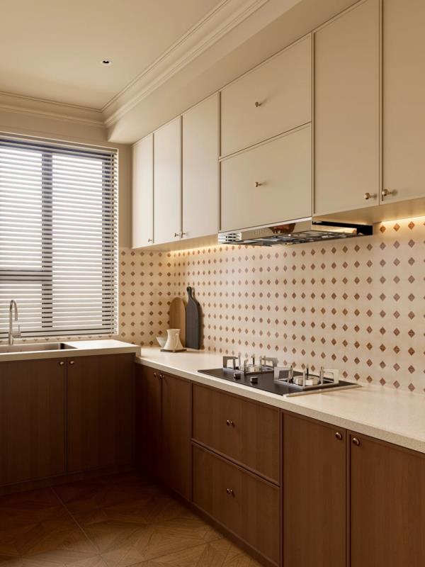 厨房空间:橱柜的配色经典又耐看,菱形图案的瓷砖墙面,细节之处尽显复古韵味。合理的布局,让烹饪动线流畅,做美食都更有动力啦。