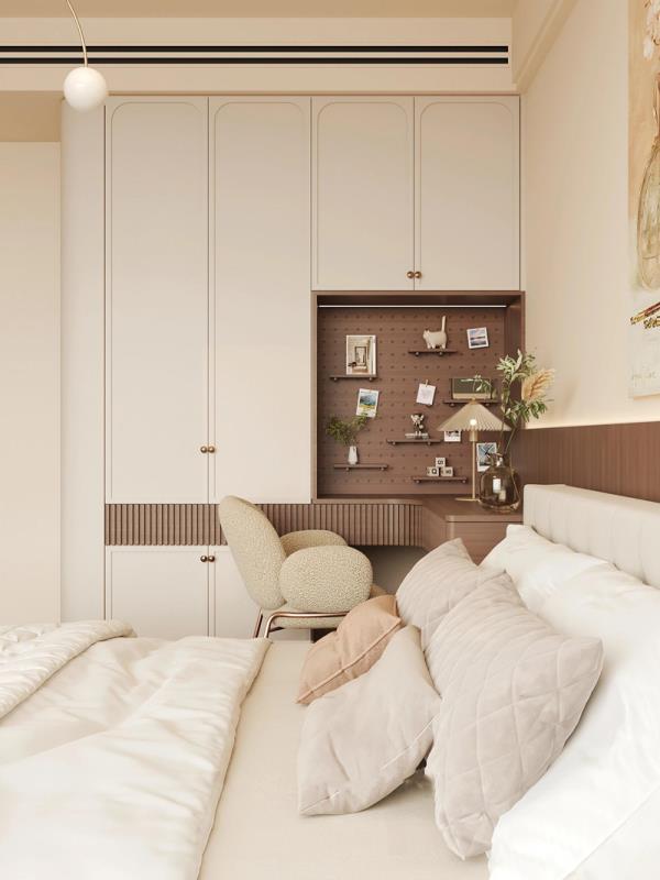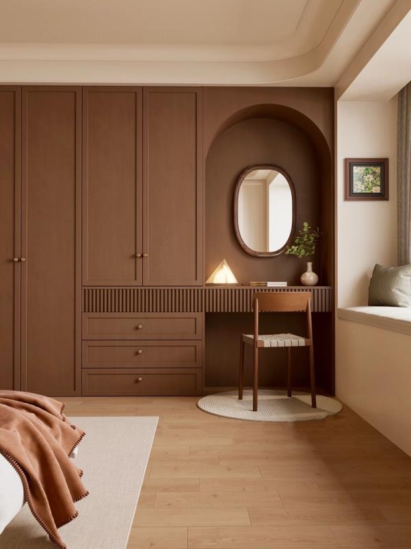 卧室角落:深棕色衣柜大气稳重,梳妆台的拱形设计复古迷人。柔和灯光、绿植点缀,打造出静谧又温馨的睡眠氛围
