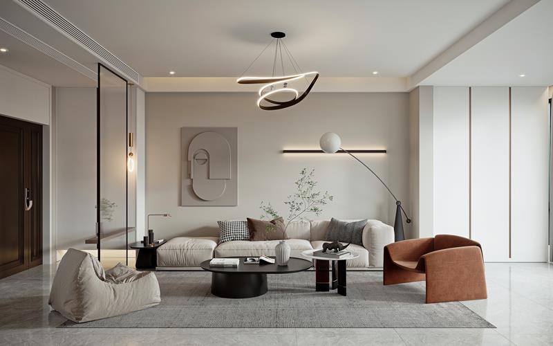 地面采用质感的大尺寸浅灰瓷砖通铺,防滑且易清洁;墙面局部使用木格栅与米白色乳胶漆拼接,增加层次感;家具以实木框架搭配浅色系布艺为主,如客厅的L型布艺沙发、餐厅的实木餐桌,兼具质感与舒适度,避免过度奢华感