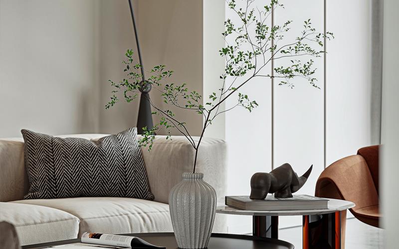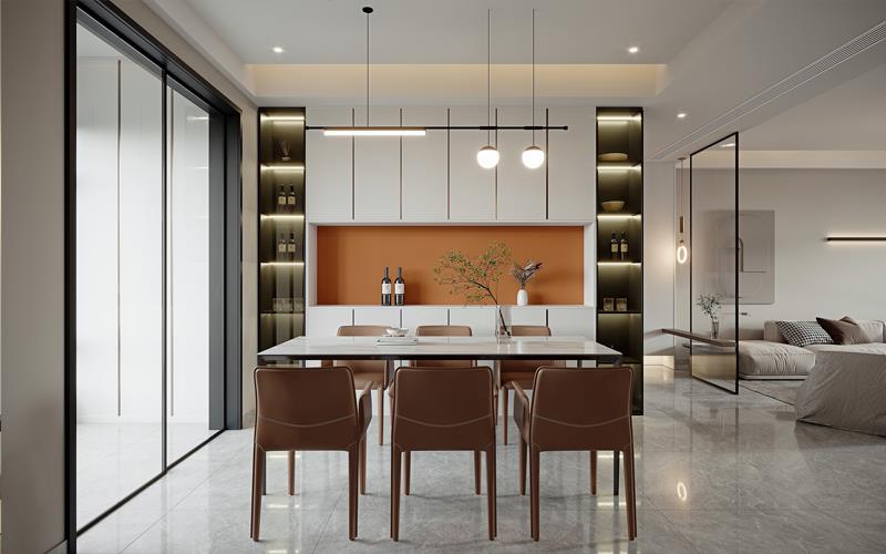 滇池澜庭案例以浅白为主色,搭配滇池景观特有的“湖蓝”作为点缀色,通过大面积落地窗引入室外自然光线,让空间更显通透开阔,同时呼应“澜庭”的临水属性