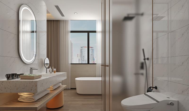 - 干湿分离卫浴配套,极简浴室柜+弧形柔光镜,干净通透好打理